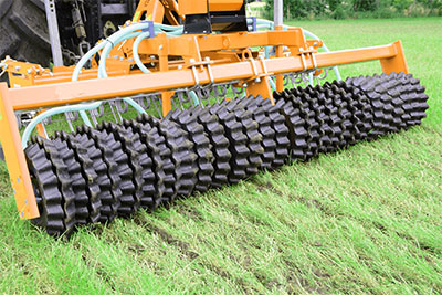 - Прикатывание: задние катки прижимают семена травы для быстрого и успешного прорастания. Прикатывание также активизирует жизнедеятельность почвы и способствует кущению уже существующих трав.